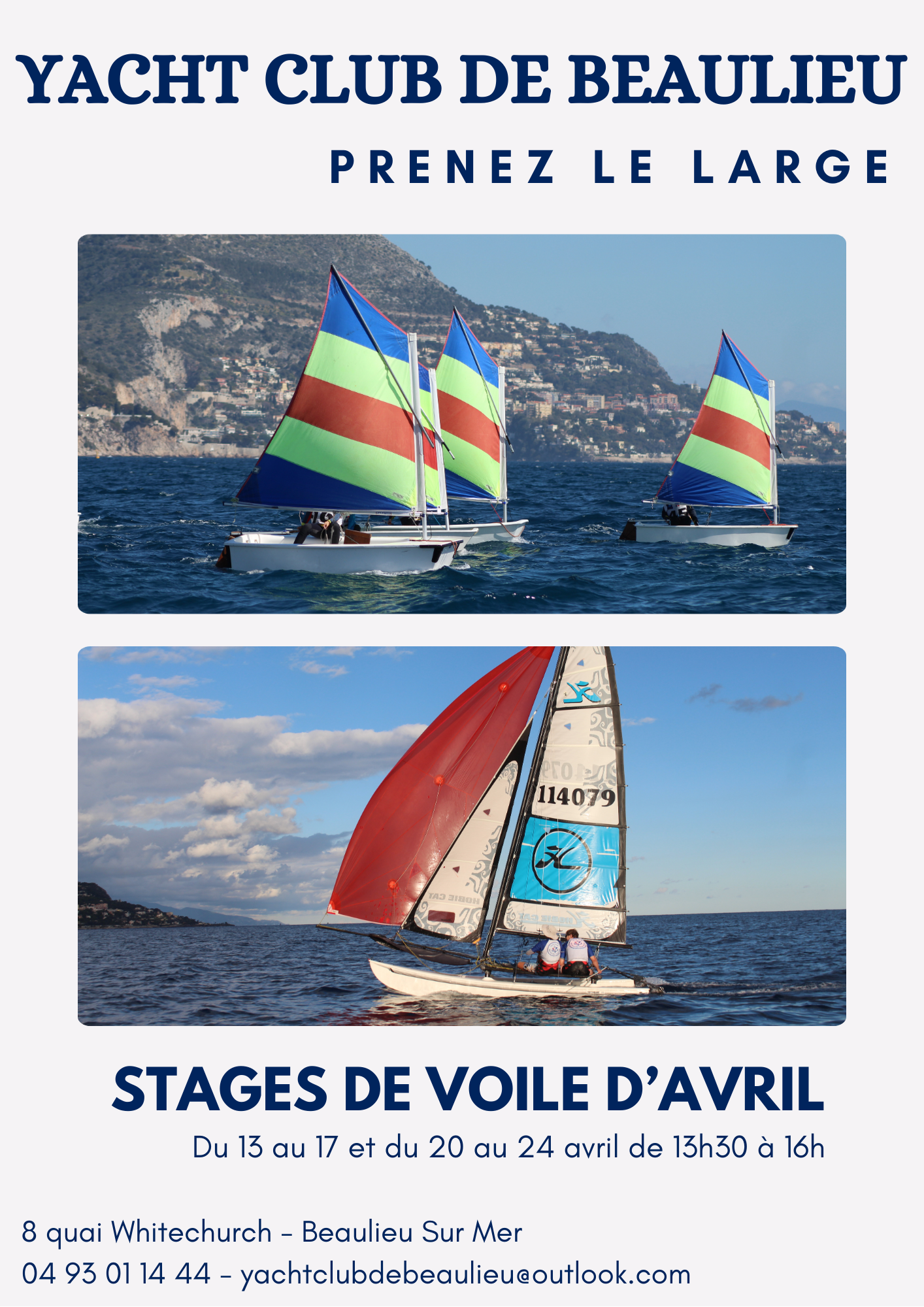 - Stage d'avril 2026 : du 13 au 17 et du 20 au 24 Avril, stage optimist et Catamaran